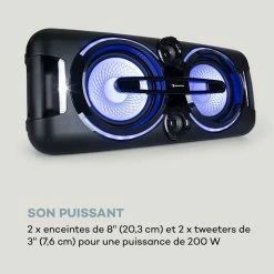 - Puissant : 2 x enceintes de 8″ (20,3 cm) et 2 x tweeters de 3″ (7,6 cm) pour une puissance de 2 x 50 W RMS