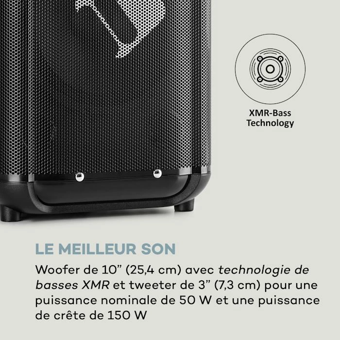 - Un son parfait : woofer de 10″ (25,4 cm) avec XMR-Bass-Technology et tweeter de 3″ (7,3 cm) pour une puissance nominale de 50 W et une puissance de crête de 150 W
