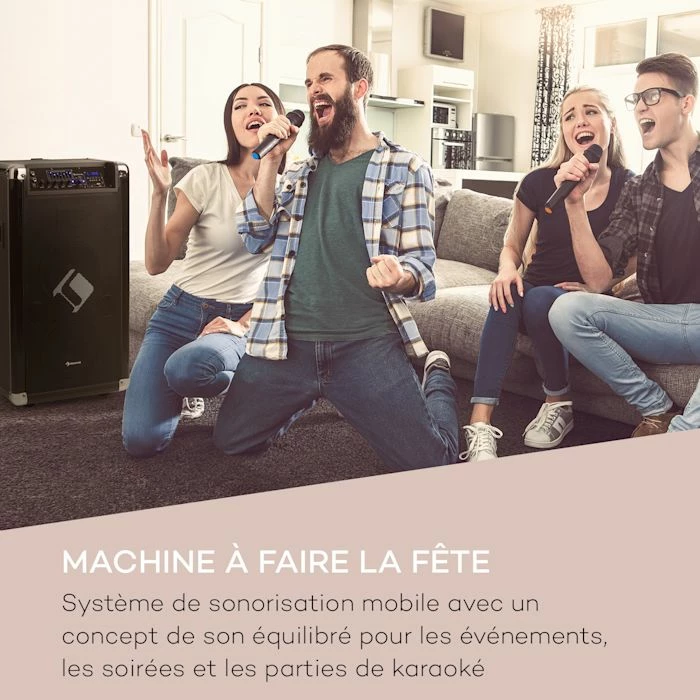 - Party machine : chaîne DJ-karaoké mobile avec concept sonore équilibre pour les évènements, fêtes et sessions karaoké