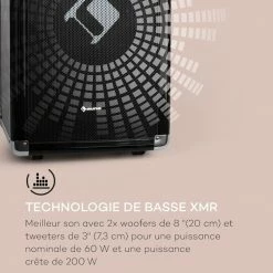 - Technologie XMR-Bass : son optimal avec 2 x woofers 8″ (20 cm) et tweeter de 3″ (7,3 cm) avec puissance nominale de 60 W et pic de puissance de 200 W
