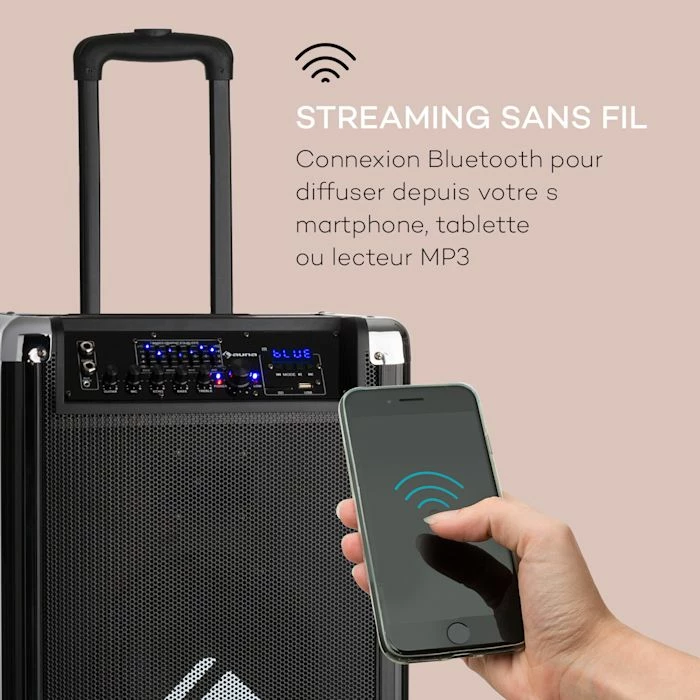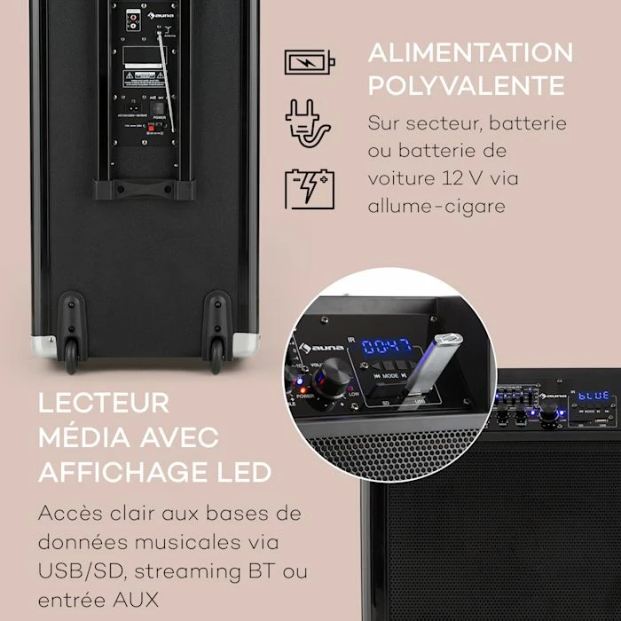 - Lecteur multimédia avec écran LED : accès intuitif aux banques de données musicales via USB, SD, Bluetooth ou entrée AUX