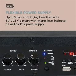 - Alimentation flexible : jusqu’ á 5 h d’autonomie grâce á une batterie de 5 A / 12 V avec affichage du niveau de charge et possibilité d’alimenation par 12 V