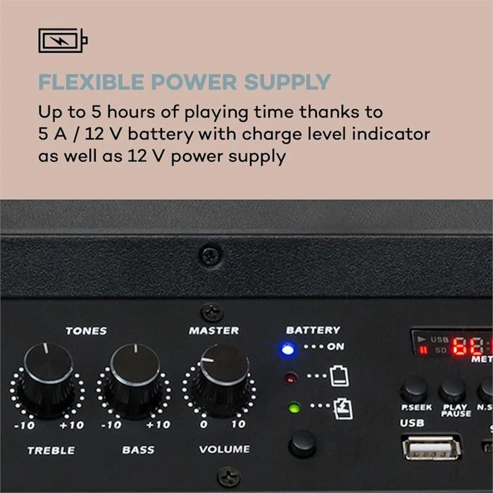 - Lecteur média avec écran LED : accès lisible aux banques de données musicales par USB, SD, streaming Bluetooth ou entrée AUX