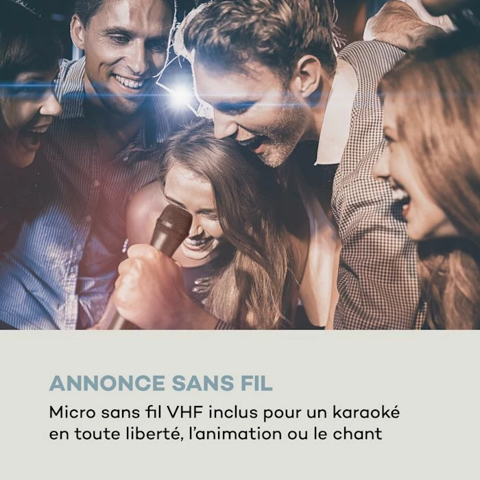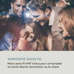 - Annonces sans fil : micro VHF sans fil inclus pour le karaoké, les animations ou la chanson