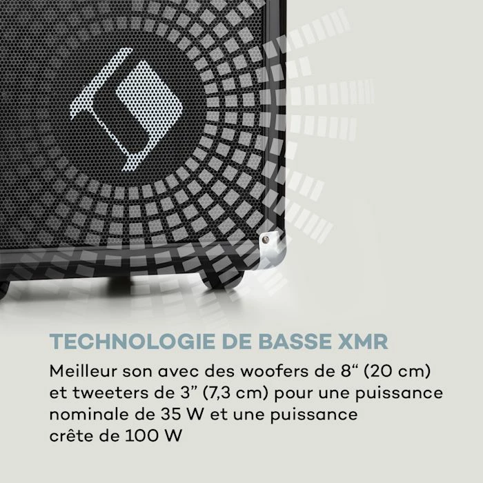 - Technologie de basses XMR : un meilleur son avec un woofer de 8″ (20 cm) et un tweeter de 3″ (7,3 cm) à 35 W de puissance nominale et 100 W de puissance de crête