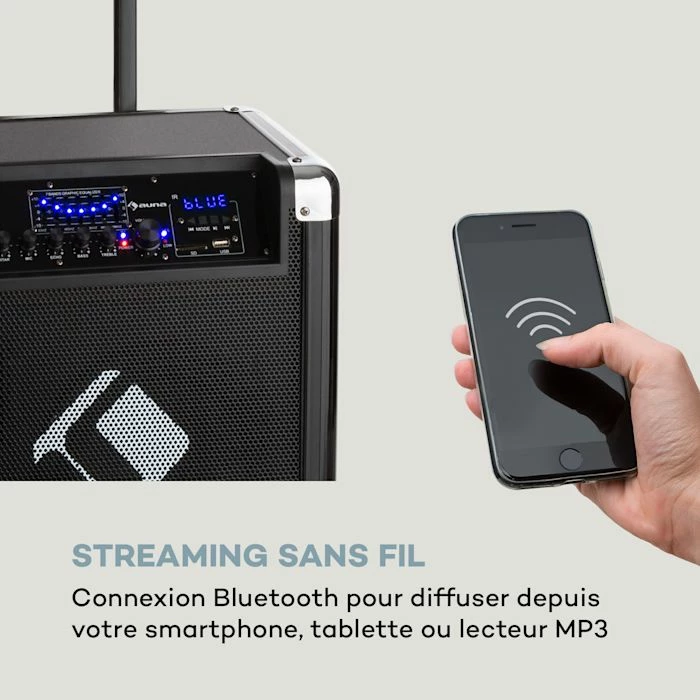 Découvrez la machine à faire la fête ! Le système de sono auna Moving 80 est l’ultime solution pour organiser des fêtes, soirées, parties de karaoké, ou comme système audio privé. Grâce à sa mobilité, il est immédiatement prêt à l’emploi et transforme n’importe quel endroit en une scène rayonnante.
