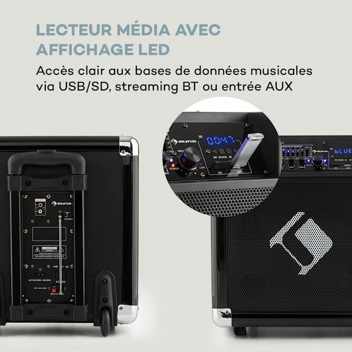 - Lecteur de média avec écran LED : accès lisible aux bases de données musicales par USB, SD, streaming Bluetooth ou entrée AUX