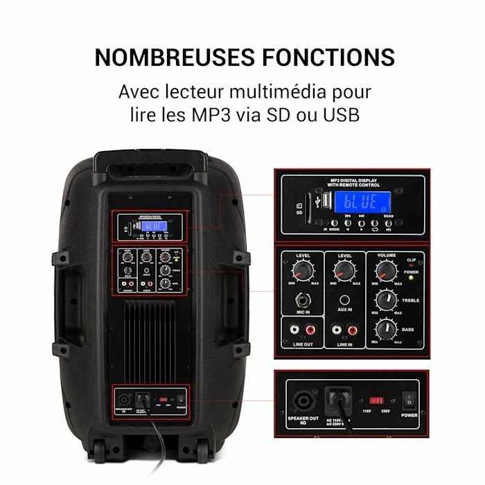 Les deux enceintes actives et passives 2 voies de 15″ ont une puissance de 160 watts RMS et convainquent par leur reproduction sonore prĂ©cise et sans distorsion avec une puissance maximale de 800 W. Un lecteur multimĂ©dia facile Ă piloter avec la tĂ©lĂ©commande Bluetooth est disponible pour lire des fichiers MP3 via SD ou USB et vous permet de diffuser facilement de la musique depuis un smartphone ou une tablette.