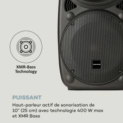 - Beaucoup de puissance : enceinte active de sono de 10″ (25 cm) et 400 W max avec technologie XMR Bass