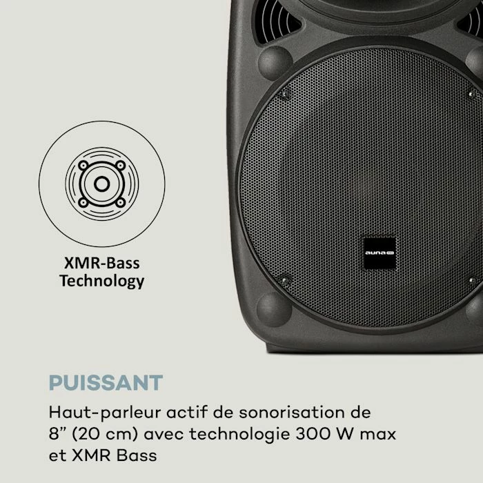 - Beaucoup de puissance : enceinte active de sono de 8″ (20 cm) et 300 W max avec technologie XMR Bass