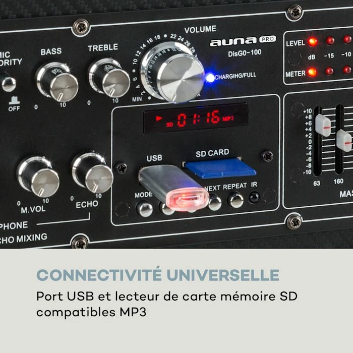 - Connectivité universelle : port USB et lecteur de cartes SD compatibles MP3 pour plus de variété musicale