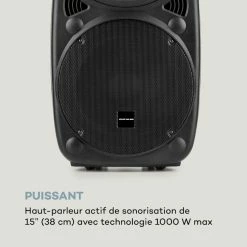 - Subwoofer de 38 cm (15″) et un tweeter de 6,35 cm (2,5″) pour une puissance de 40 Watt RMS (max. 1000 W)