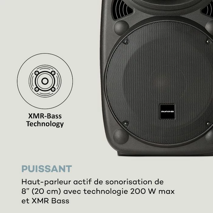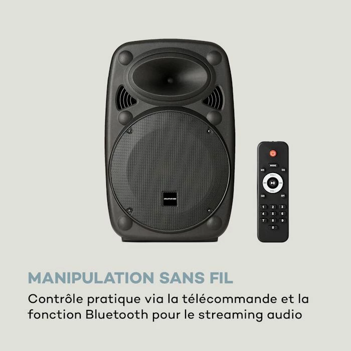 Le puissant subwoofer de 8″ (20 cm) auna Pro Streetstar 8 du système de sono mobile fournit au public des basses Ă faire frĂ©mir grâce Ă la XMR Bass Technology, tandis que le tweeter assure un son bien Ă©quilibrĂ©. Les multiples possibilitĂ©s de connexion fournissent le son que vous souhaitez : par connexion Bluetooth avec les listes de lecture de votre smartphone, tablette ou lecteur MP3, par le port USB et le lecteur de cartes SD, ou par l’entrĂ©e AUX pour d’autres appareils hi-fi audio tels que les lecteurs de CD et les systèmes stĂ©rĂ©o. L’une des deux entrĂ©es micro peut bien sĂ»r fournir un accès pour une guitare Ă©lectrique. Le micro sans fil UHF promet de fantastiques performances de karaokĂ©, des performances vocales entraĂ®nantes et des prĂ©sentations qui dĂ©mĂ©nagent. Sans ĂŞtre entravĂ© par des câbles, vous ĂŞtes mis en valeur mĂŞme Ă grande distance, avec une transmission sans coupure – parfait pour faire participer tous les publics.