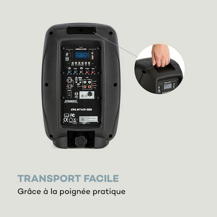 Le système de sono auna Pro Streetstar 8 est idĂ©alement Ă©quipĂ© pour une utilisation mobile lors d’Ă©vĂ©nements : le boĂ®tier en ABS robuste rĂ©siste Ă de nombreux chocs, tandis que des poignĂ©es de transport pratiques facilitent le dĂ©placement du système. Une batterie puissante de 3 Ah avec une autonomie de 3 Ă 5 heures garantit une utilisation souple, tandis que l’indicateur de niveau de charge empĂŞche une interruption inattendue de la transmission. Bien entendu, vous pouvez aussi connecter le Streetstar 8 au secteur facilement. Le système de sono dispose d’un affichage Ă LED pour afficher des informations sur le titre et l’artiste et que vous restiez toujours informĂ©. Une tĂ©lĂ©commande toutes fonctions permet de contrĂ´ler l’appareil mĂŞme de loin.