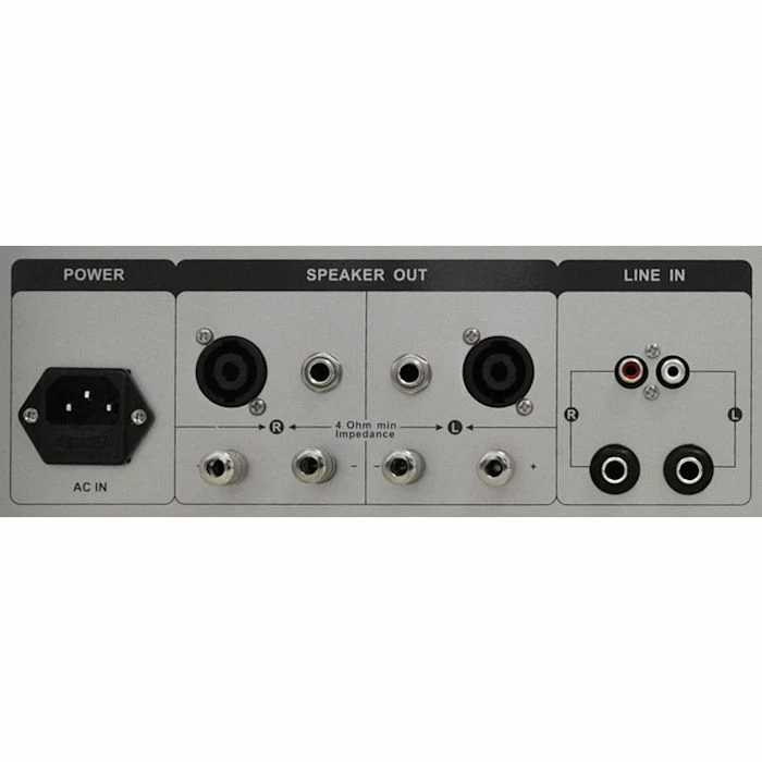 - Connecteurs: RCA-Line-In, 2 x jack 6,3 mm, 2 x Speakon, 2 x XLR, 2 x Bornes Ă vis stereo(voir photo)