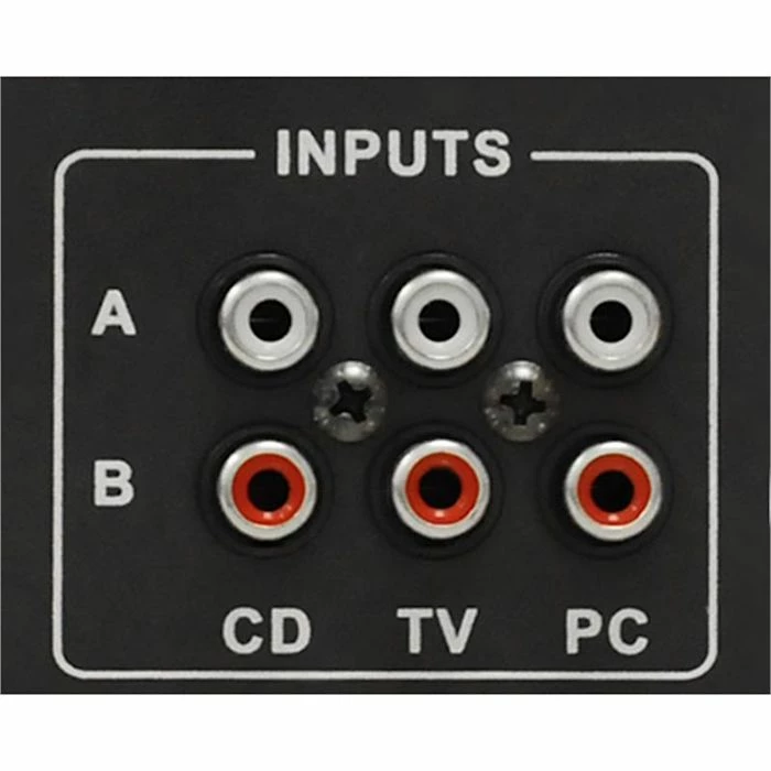 - Connexions: 1 x entrée jack 3,5 mm (située à l’avant), 2 x sortie stéréo bornes à vis, 3 x entrée stéréo RCA