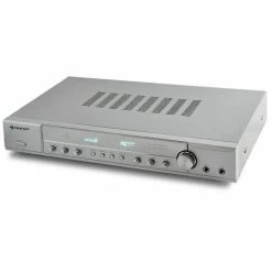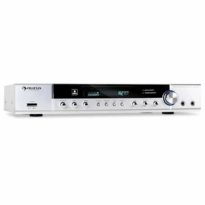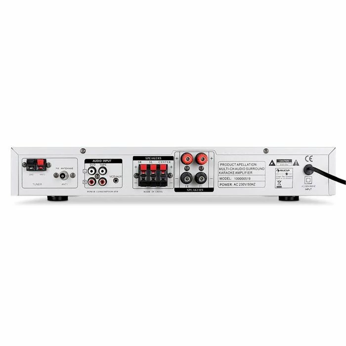 - Connexions: 2 x entrées jack 6,3 mm pour micro (avant), 2 x entrées ligne RCA stéréo, 1 x entrée AUX jack 3,5 mm, 2 x jeux de bornes à vis pour connecter les haut-parleurs, 3 x bornes pour raccorder les enceintes surround