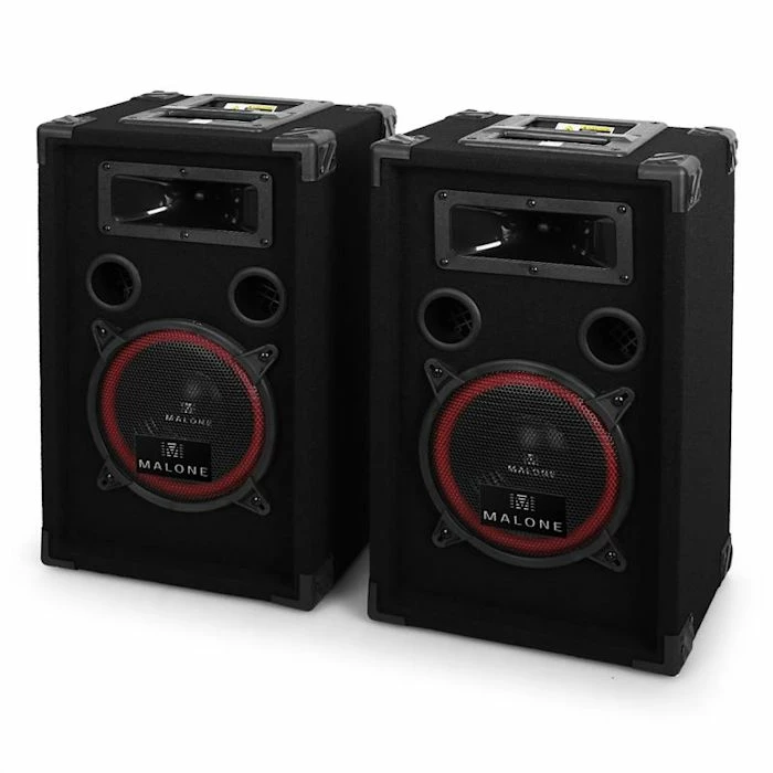 - Paire d’enceintes de sono passives avec un subwoofer de 20 cm (8“), un boĂ®tier Bassreflex et un tweeter Horn