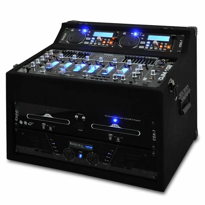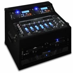 Le set DJ PA « Punch Line » se compose d’un double lecteur CD/USB, d’un ampli PA, d’une table de mixage 4 canaux et d’une paire d’enceintes avec pieds conformes.