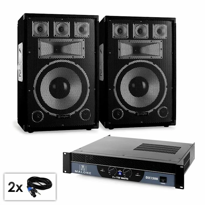 Puissant set de sono comprenant 2 enceintes passives 12″ 200W RMS chacune et un ampli pontable 2 canaux 1500W max.