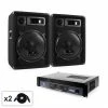 Puissant set de sono comprenant 2 enceintes passives 15″ 250W RMS chacune et un ampli pontable 2 canaux 2000W max.