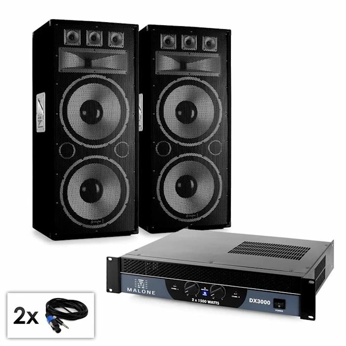 Puissant set de sono comprenant 2 enceintes passives 2×15″ 300W RMS chacune et un ampli pontable 2 canaux 3000W max.