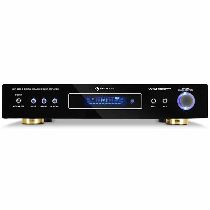 - Connexions: 2 x entrées jack 6,3 mm pour micro (avant), 2 x entrées ligne RCA stéréo, 1 x entrée AUX jack 3,5 mm, 2 x jeux de bornes à vis pour connecter les haut-parleurs, 3 x bornes pour raccorder les enceintes surround, 1 x sortie RCA pour connecter un subwoofer actif externe