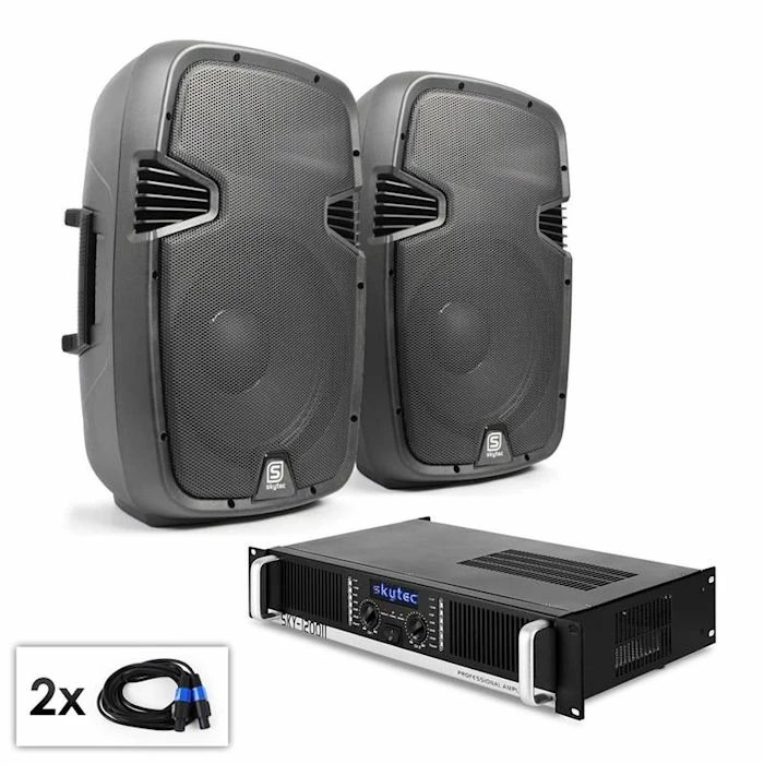 Puissant set de sono comprenant 2 enceintes passives 8″ 200W RMS chacune et un ampli pontable 2 canaux 1200W max.