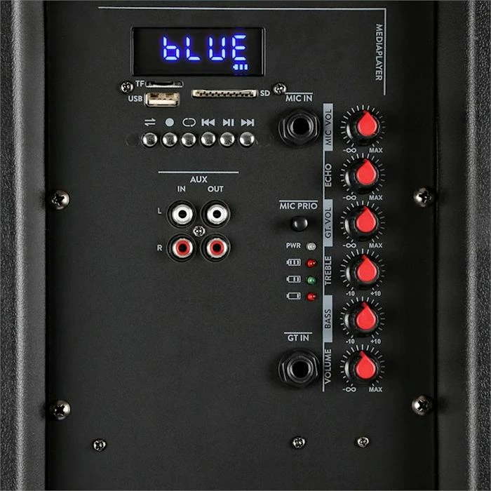L’enceinte mobile Fenton FT215LED de 1600 watts en puissance de sortie fournit des basses puissantes avec ses 2x subwoofers de 15″ et des aigus clairs avec son tweeter de 1″. Vous pouvez alors diffuser de la musique sans fil via Bluetooth depuis un smartphone ou une tablette, ou bien accĂ©der aux bases de donnĂ©es MP3 par les ports USB et le lecteur SD, ou encore accĂ©der aux sources audio classiques telles que les chaĂ®nes stĂ©rĂ©o, lecteurs CD ou radios par l’entrĂ©e AUX. L’entrĂ©e de guitare de 6,3 mm peut Ă©galement ĂŞtre utilisĂ©e pour amplifier le son d’une guitare Ă©quipĂ©e Ă cet effet Ă l’aide de l’enceinte. L’Ă©clairage LED intĂ©grĂ© au woofer offre une ambiance colorĂ©e Ă votre soirĂ©e. Le rĂ©glage du son, les aigus, les graves, l’effet Ă©cho du micro et son volume ainsi que le volume master et celui de la guitare peuvent ĂŞtre contrĂ´lĂ©s sĂ©parĂ©ment au dos de l’appareil.