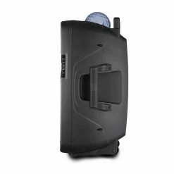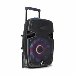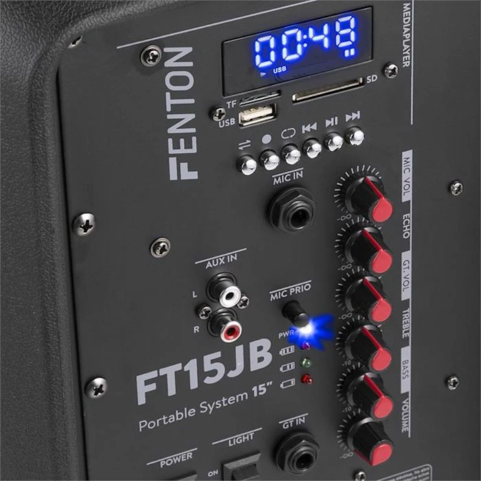 L’enceinte mobile Fenton FT15JB de 800 watts en puissance de sortie fournit des basses puissantes avec son subwoofer 15″ et des agus clairs avec son tweeter de 1″. Vous pouvez alors diffuser de la musique sans fil via Bluetooth depuis un smartphone ou une tablette, ou bien accĂ©der aux bases de donnĂ©es MP3 via le lecteur multimĂ©dia intĂ©grĂ© par les ports USB et le lecteur SD, ou encore accĂ©der aux chaĂ®nes stĂ©rĂ©o, lecteurs CD ou radios par l’entrĂ©e AUX classique. L’Ă©clairage LED intĂ©grĂ© au woofer ainsi que la Jellyball sur le dessus offrent une ambiance colorĂ©e Ă votre soirĂ©e. Le rĂ©glage du son, les aigus, les graves, l’effet Ă©cho du micro et son volume ainsi que le volume principal peuvent ĂŞtre contrĂ´lĂ©s sĂ©parĂ©ment.