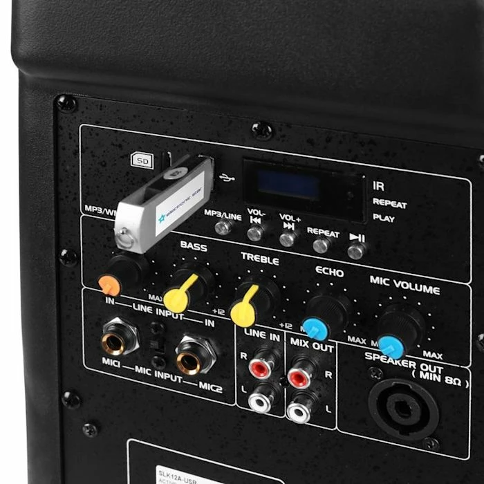 - Connectiques: 1 x Entrée USB, 1 x Entrée SD, 1 x Entrée stéréo ligne RCA, 1 x Sortie stéréo ligne RCA, 1 x Sortie PA, 2 x Entrées micro Jack 6,3 mm