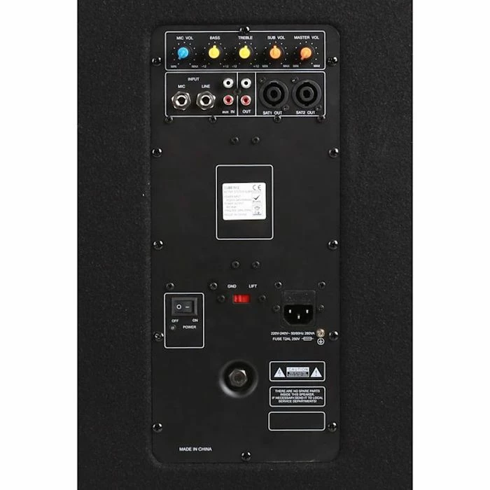 - Connexions: 2 x d’entrĂ©e microphone 6,3 mm, 1 x entrĂ©e RCA stĂ©rĂ©o, 1 x RCA sortie de ligne pour connecter un autre composant actif, 2 x sortie Speakon pour le raccordement des Haut-parleurs passif