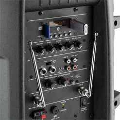 - Connectiques : 1 x Port USB, 1 x carte SD/MMC, 1 x entrée jack AUX 3,5mm, 1 x entrée stéréo RCA ligne, 2 x entrées micro jack 6,3mm, 1 x sortie ligne RCA stéréo