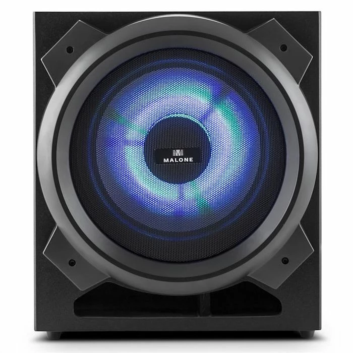 - Conception bass-reflex avec revêtement en relief et effet de lumière LED réglable aux couleurs RVB