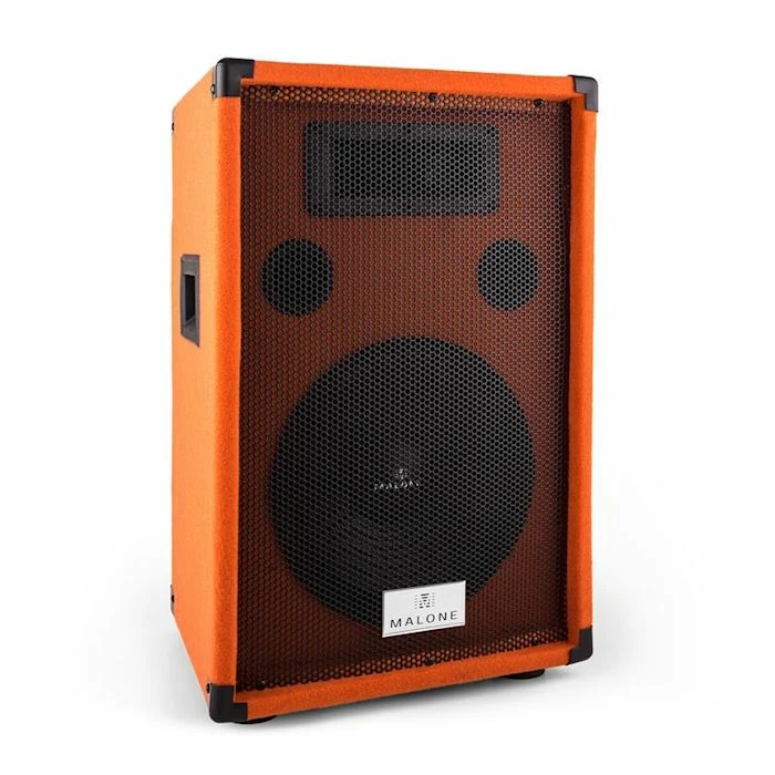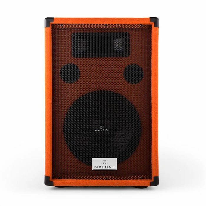 Set de haut-parleurs PA polyvalent et revĂŞtement en feutre orange Malone pour karaokĂ©, repas et soirĂ©es privĂ©es. Construction rĂ©sistante avec coins renforcĂ©s ainsi qu’une poignĂ©e de transport pour une utilisation nomade. CapacitĂ© de 200W RMS ou 400W max. et son caisson de basses de 25cm (10″).