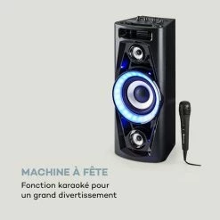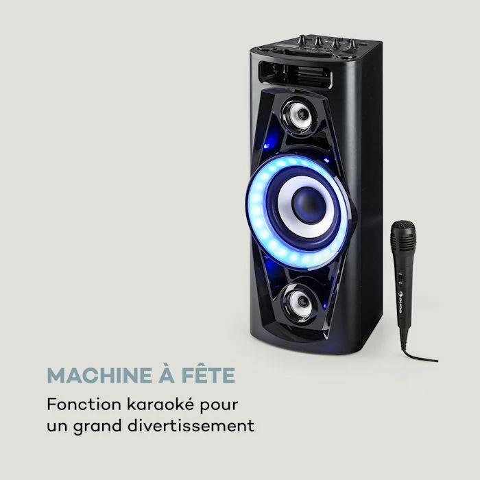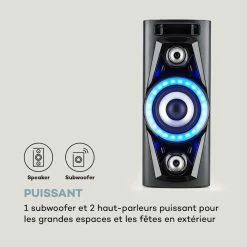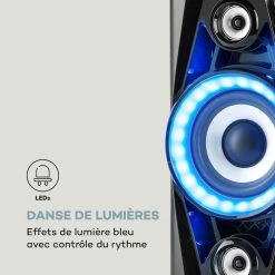 - Eclairage bleu : jeu de lumière LED sensible Ă la musique pour l’Ă©clairage de la membrane des enceintes