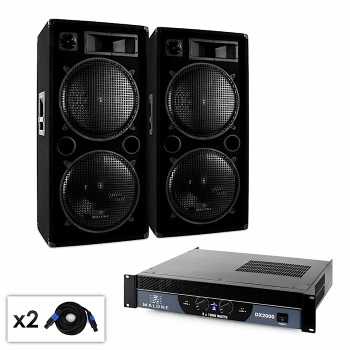 Puissant set PA avec 2 enceintes passives de 750W RMS chaque, un ampli pontable 2000W max et tout le câblage nécessaire.