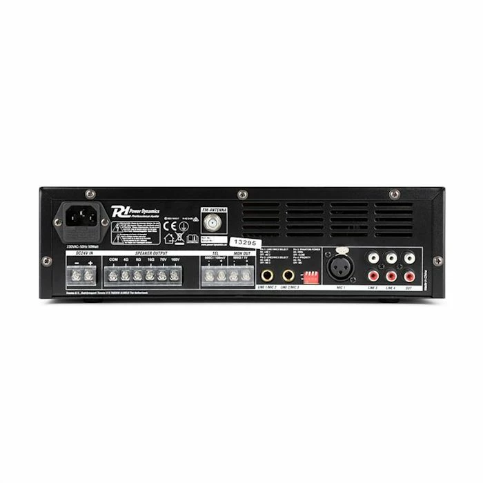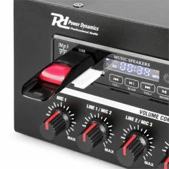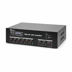 L’amplificateur Power Dynamics PBA120 100V convainc par sa puissance et sa fiabilitĂ© et convient avant tout pour une utilisation avec des chaĂ®nes de petite et moyenne taille. Cet amplificateur avec une puissance maximale de 120 Watt dispose de ports USB et SD compatibles MP3 et garantit un streaming audio fiable grâce Ă sa fonction Bluetooth intĂ©grĂ©e. Un Ă©galiseur avec prĂ©rĂ©glages ainsi qu’un rĂ©gleur de basses et d’aigus garantit une expĂ©rience sonore complète Ă tout moment, tandis que 3 entrĂ©es microphone et 2 entrĂ©es stĂ©rĂ©o-line permettent un branchement sans accrocs sur des sources musicales extĂ©rieures. Une tĂ©lĂ©commande infrarouge pratique offre un grand confort d’utilisation. Enfin, des connexions facultatives Ă 4 / 8 / 16 Ohm ainsi qu’Ă 70V et 100V sont Ă©galement proposĂ©es.