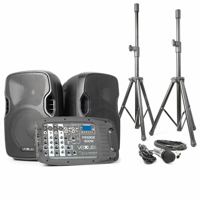 - Système audio PA mobile avec 300W max. et deux trépieds pliables